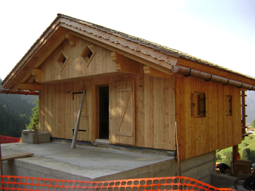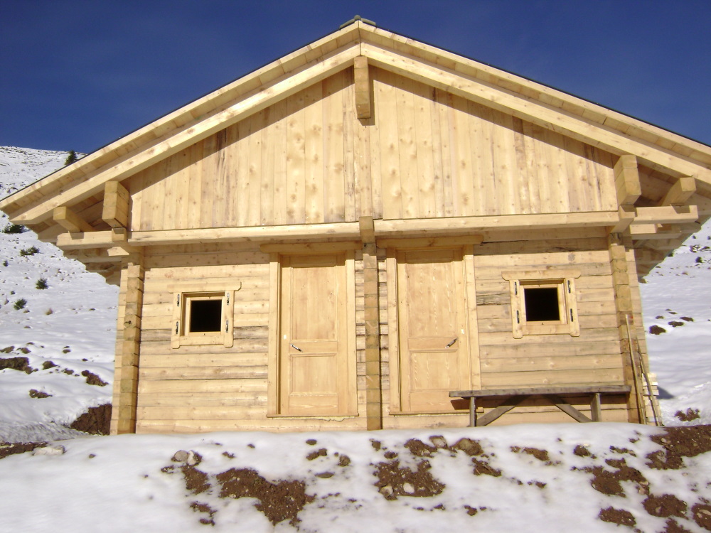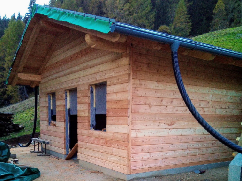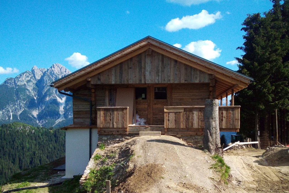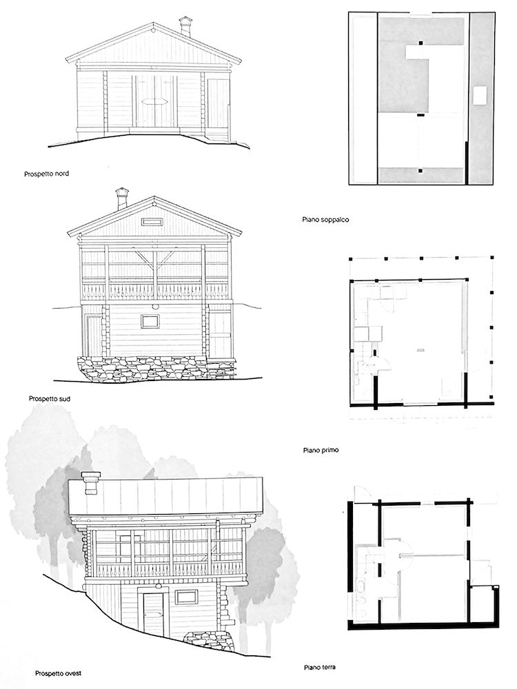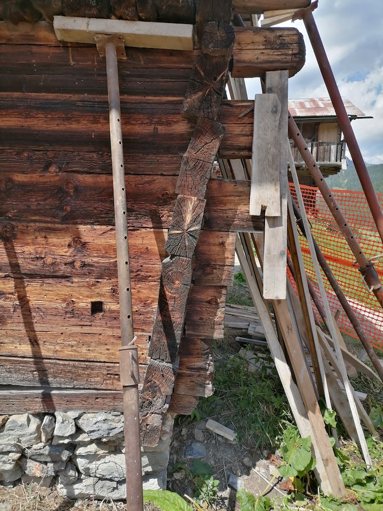 L’intervento di ristrutturazione è avvenuto nel totale rispetto dell’architettura preesistente, smontando ogni singolo elemento – alcuni rimossi per ripristinare la verticalità originaria – per poi rimontarli dopo aver messo a piombo tutta la struttura. Il progetto è stato finalizzato a mantenere la composizione originaria sia nella struttura che nelle finiture, quali chiodature, cerniere ed elementi di fissaggio in legno. Il recupero e ripristino dei materiali fanno del legno il vero protagonista in tutte le sue possibili combinazioni: come il larice, scuro nelle sue facciate più esposte a sud e grigio in quelle meno esposte al sole.